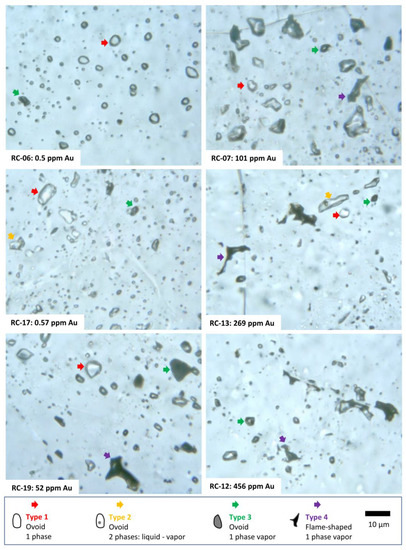 Photomicrographs showing the petrographic characteristics of fluid inclusions. Selected samples are ordered according to gold grade as indicated in ppm. Type 1 appears more abundant in low gold grade, where type 3 and 4 are dominant in gold-rich samples. Type 2 was observed only in 2 samples. The Zerene Stacker software was used to enhance the focus.