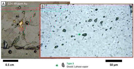Link between fluid inclusions and visible gold. (A) Photomicrograph of visible gold grains hosted in quartz: sample RC-08 with 124.99 ppm Au. The red rectangle is the location of Figure 7B. (B) Photomicrograph of fluid inclusions of type 3 aligned toward the visible gold grains, supporting the genetic link between the gaseous fluid inclusions and gold mineralization.