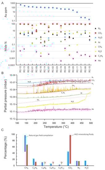 Results of the fluid inclusion analysis by solid probe mass spectrometry. (A) Logarithmic graph of mole % of volatile components of quartz samples from the HGZ, ordered according to the gold grade of the samples. (B) Example of a mass spectrometric time-resolved signal generated over the temperature range of 100–500 °C for the 10 volatiles analyzed for sample RC-18. Fluid inclusion decrepitations are manifested by the sawtooth signal above the background. (C) Comparison between the ranges of composition for fossil gas [32] versus the mineralizing fluids documented for the HGZ (this study).