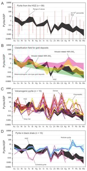 Multi-element diagrams from Genna et al. [33] for pyrites analyzed by LA-ICP-MS and normalized to ASP (Archean Sedimentary Pyrite). (A) Result for pyrites from the HGZ. The range of values is given by the red lines whereas values between the 25th and 75th percentiles are delimited by the black envelope. Data considered relatively homogeneous as values within the 25–75th percentile field are not spreading more than one order of magnitude. (B) Classification patterns for orogenic gold deposits of the Abitibi belt, based on >1000 pyrite analyses from 18 well-studied gold deposits [33]. The HGZ data, illustrated by the 25–75th percentile envelope, plot closer to the metamorphogenic field. (C) Volcanogenic pyrite data from 3 different mineralized zones, showing very different patterns in comparison to the HGZ pyrites. (D) Pyrites from a graphitic black shale horizon (Figure 1), showing similarity with the HGZ pyrites.