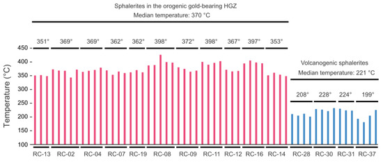 Graph of temperatures calculated with the GGIMFis geothermometer [21] for the HGZ and volcanogenic sphalerite grains. Samples from the HGZ are ordered according to their depth (Figure 3). Given temperatures are median values for each sample.