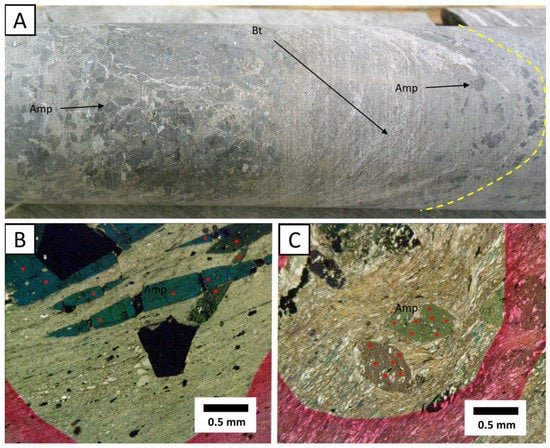 Amphibole textural relationships. (A) Photograph of a drill core where prismatic amphiboles (Amp) overprint the schistosity (dashed yellow line) defined by aligned biotites (Bt) in mafic rocks. (B) Photomicrograph (polarized light) showing needle-shaped amphiboles overprinting the schistosity (chlorite), sample RC-22. (C) Photomicrograph (polarized light) showing prismatic-shaped amphiboles with warped biotite-bearing schistosity, sample RC-35. The red dots in (B) and (C) are microprobe spot analyses.