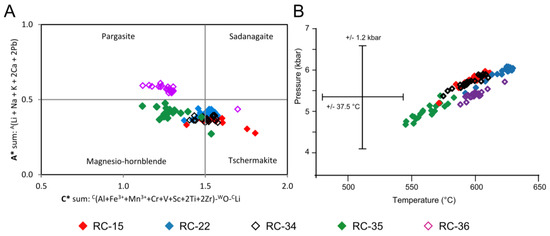 Amphibole compositions and geothermometric data. (A) Plot of the calcic-amphiboles in the classification diagram of Hawthorne et al. [36], where A* and C* refer to the summation of various ions, as stated. (B) Pressure–temperature diagram developed using the method of Zenk and Schulz [23].