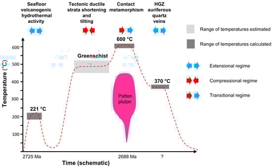 To test the various hypotheses for gold enrichment, is it fundamental to constrain the tectonic and thermal evolution of the mineralizing system, from primary volcanogenic ore to late gold-rich quartz veins (Figure 13). The tectonic evolution can be bracketed in time by the age of the host Beaupré rhyolite (2725 Ma) and the syn-tectonic Patten pluton (2688 Ma). The thermal evolution is constrained by the amphibole temperature (600 °C) for the peak metamorphism related to the Patten pluton and sphalerite temperature for the late gold (370 °C) and volcanogenic mineralizations (221 °C). Since orogenic gold mineralizations are commonly in thermal equilibrium with their host rocks [37], a cooling of ~230 °C occurred before the formation of the HGZ (Figure 13). Too many parameters remain undetermined to calculate the conductive cooling rate and thus a timeframe for the late formation of the gold mineralization. Nevertheless, the tectono-thermal evolution indicates a late formation of the HGZ. However, a post-Archean formation appears unlikely as the HGZ is cut by a Proterozoic dyke (Figure 3), a typical feature of all the orogenic gold mineralizations in the Archean Abitibi belt [7].