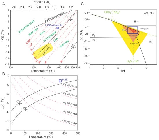 Our data cannot prove the direct involvement of liquid petroleum for transporting gold and zinc. Nonetheless, liquid petroleum is unlikely to occur at moderate temperatures (370 °C) as recorded for the HGZ formation, because the thermal cracking of liquid petroleum into lighter gaseous hydrocarbon phases begin at ~150 °C [68] with a total gasification at >220 °C [69]. Consequently, the high solubility documented for Au and Zn in liquid crude oil [65] should be in gaseous hydrocarbon phases at >200 °C. Nevertheless, the specific bonding between gold and liquid hydrocarbons remains to be established, but the thiol group (–SH) is the most likely [63,64]. The HGZ contains sphalerite in percentage and lesser pyrite, indicating a high concentration of sulfur available in the fluids. H2S is also recorded in fluid inclusions for some samples (Figure 8A). Furthermore, an intermediate sulfidation state (log ƒS2 = −6) is determined (Figure 14A). All of these imply a significant content of sulfur, possibly occurring as thiol in the mineralizing fluid.