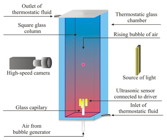 Variations in the local velocities of a single bubble rising in an aqueous phase of different physicochemical properties (tuned by a temperature modification), according to the values given in Table 1) were determined using digital camera observations coupled with image analysis and ultrasonic sensor data. The set-ups used for both experimental approaches are schematically illustrated in Figure 1, and, in both cases, the main parts were identical: a square glass column (40 mm × 40 mm × 400 mm) with a thick-walled glass capillary (inner diameter dc = 0.0753 mm) sealed at the bottom and an automatic bubble generator (Bubble-on-Demand [28]) to form a single bubble with control over its detachment frequency (adjusted to 60 s). Moreover, in both experimental approaches, the column with the tested liquid was placed and sealed inside the larger, outer square glass column (60 mm × 60 mm × 400 mm) to maintain the liquid’s temperature in the inner column at the desired level. Before each experimental series, the temperature was adjusted using a circulating water bath (Thermo Scientific SC100-A10, Waltham, MA, USA), and this process was controlled by an electronic thermometer immersed in the inner column liquid.