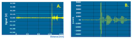 (A) Example of the signal registered during bubble rise in the liquid (aqueous phase) as a function of distance; (B) magnified signal (magnification area marked by the red line).