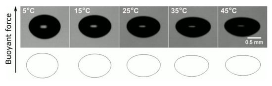 where and are the bubble’s vertical and horizontal diameters, respectively. These parameters were used further to analyze the hydrodynamics of the rising bubble under different temperature conditions.