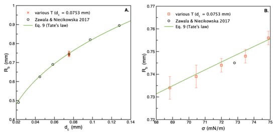 Values of the bubble radius (), calculated from the camera registered rising bubble photos are presented in Figure 4 (dc = 0.0753 mm). In addition, the values reported by Zawala and Niecikowska [30] acquired for bubbles formed at capillaries of various dc but a constant temperature T = 21 ± 1 °C were given for comparison. The solid line represents the theoretical size of the bubble detaching from the capillary, which can be calculated by balancing the buoyant (detaching) force: