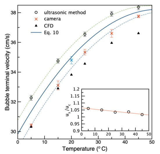 A comparison of the terminal bubble velocities (ut) is presented in Figure 5. The terminal velocity was shown as a function of the temperature. For T = 20 °C, the value from Zawala and Niecikowska’s [30] paper was used. The dashed lines in Figure 5 are second-order polynomials fitted separately to each of the datasets. The solid line is the average polynomial fit. It was evident that the bubble velocity measured by the ultrasonic sensor (us) was higher than for the image analysis (uc). However, the fitted dashed lines indicated that the relative difference between the camera and ultrasonic datasets was similar, so it was caused by a systematic rather than a random factor. It can be presumed that this difference was probably caused by assumptions made on the sound wave speed in the water phase and the different temperature values for which were taken directly from the engineering tables (see Table 2). The difference could have been caused, for example, by wave interference with the column walls. As seen in the inset in Figure 5, the difference between data obtained by both techniques, quantified by the us/uc ratio, was of order of 2–5%. The average second-order polynomial fit, which accurately described the trend of terminal velocity variations (in cm/s) with temperature (expressed in °C) within the range (solid line in Figure 5) was given as: