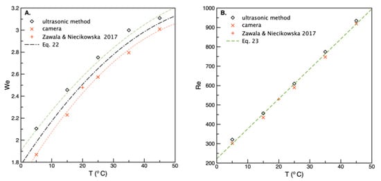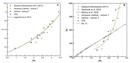 Figure 6A presents experimentally determined values as a function of the Weber number calculated for experimental data by Zawala and Niecikowska [30] and for the data obtained in our studies under various temperatures. Moreover, the data from the numerical calculations were given for comparison. In addition, the empirical relation by Legendre et al. [38] in the form: