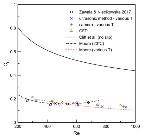 were also plotted. As could be expected, the Moore model very accurately described the literature data, obtained at room temperature in pure water. It was seen, moreover, that, after considering the temperature effect by means of Equations (14) and (15), the experimental data (determined both by ultrasonic and camera techniques) were also very well described. It showed evidence that, under various temperatures of pure water, the hydrodynamic boundary conditions of bubbles of various sizes remained unchanged and could be assumed as fully slip.