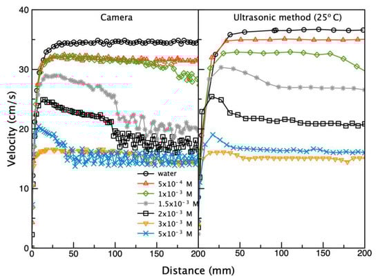 Profiles of the local bubble velocity (i.e., velocity variations as a function of the distance covered by the bubble in various concentrations of n-pentanol solutions) are presented in Figure 9. The data redrawn from Zawala et al. [44] were compared with corresponding profiles taken by the ultrasonic sensor. The literature data were obtained using the classical camera technique and manual frame-by-frame image analysis [44].