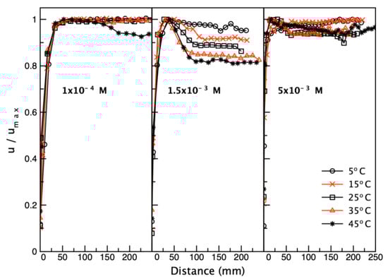 To elucidate the influence of the temperature on kinetics of the DAL formation, each bubble velocity profile, taken in the n-pentanol solution of considered temperature (Table 1) was normalized according to the maximum velocity value (umax). The umax values for chosen n-pentanol concentration are presented in Table 4. As seen, the bubble maximum velocity increased with the temperature—this result was consistent with the reports by Zhang et al. [20], who observed a similar trend in Triton X-100 solution of concentration 1.25 × 10−4 mol/m3. Figure 10 presents a comparison of normalized velocity for three chosen n-pentanol concentrations. The concentration 1 × 10−4 and 5 × 10−3 M corresponded to the concentrations where the DAL was established just after the bubble acceleration period, while the concentration 1.5 × 10−3 M was intermediate, where the DAL formation was associated with a maximum velocity existence.