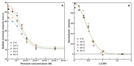 Influence of temperature on (A) bubble terminal velocity as a function of n-pentanol concentration and (B) normalized velocity () as a function of c/CMV (data acquired using the ultrasonic method).