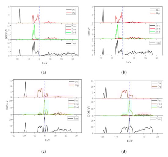 Calculating the metal oxide cell and the complete-cleavage surface state density can provide the surface atomic activity size because the physical and chemical reactions always occur near the Fermi level. The closer to the Fermi level, the stronger the electronic activity. The farther the energy level, the lower the energy. In the latter case, the electron does not easily participate in the reaction [34,35,36]. Figure 1 shows the comparison of the density of states of the four single minerals; the dotted green lines indicate the Fermi energy levels of each metal oxide.