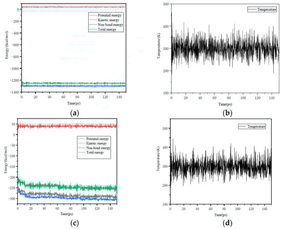The establishment of a stable interaction model is the premise for analyzing the interaction mechanism by ChCl and MA on the complete-cleavage surface of the four metal oxides and the basis of molecular dynamics simulation. Therefore, by optimizing the surface model of the complete-cleavage surface of the four metal oxides and the stable ChCl-2MA eutectic solvent model, the ‘Build Layer’ was used to add the molecular layer of the ChCl-2MA eutectic solvent to the four metal oxides. On the physical surface, a mineral–drug interaction model was established, and a certain vacuum layer was included to reduce the influence of periodic structure. The established interaction model was optimized, and kinetic calculations were carried out with the Forcite module [38,39]. During the calculation, the force field was COMPASSⅡ, and the charge distribution was Forcefield-assigned. Furthermore, the calculation accuracy was set to ‘Fine‘, and the electrostatic potential and van der Waals summing methods were the Ewald- and Atom-based, respectively. Various parameters, such as energy, temperature, and stable interaction model, were calculated using molecular dynamics, and the interaction energy and radial distribution function were calculated using the stable interaction model. Thus, the interaction mechanism between ChCl-2MA and the four metal oxides was studied. Figure 4 shows the variations in energy and temperature in the molecular dynamics simulation of the four metal oxides and ChCl-2MA. In addition, Figure 5 shows the interaction model of the four metal oxides and that of ChCl-2MA, which were obtained using the simulation.