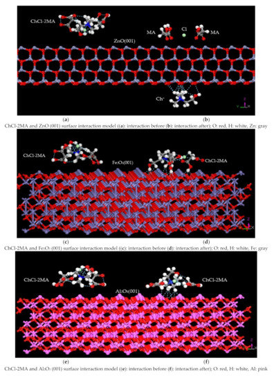 - It can be seen from the energy change determined by molecular dynamics that ChCl-2MA is more likely to interact with the ZnO (001) surface. The variation in energy shows that ChCl-2MA is more inclined to interact with ZnO (001). The results also show that the interaction between ZnO and ChCl-2MA is the strongest, and the interaction of the metal oxides with ChCl-2MA decreases in the following order: ZnO > Fe2O3 > Al2O3 > CaO.