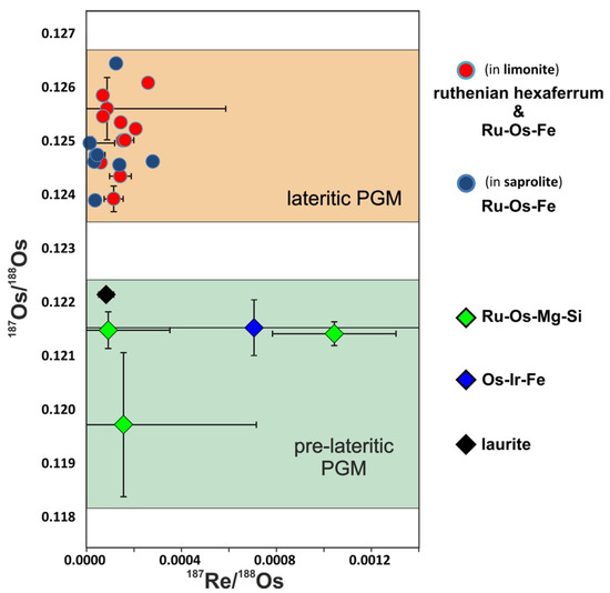 The analyzed grains include the two different types of PGM identified within the lateritic profiles [14,15,16] (Figure 1): (1) high-temperature magmatic PGM preserving their pristine textural signatures (e.g., laurite included in chromite) or intermediate-temperature PGM produced by reworking of the former during serpentinization (hereafter pre-lateritic PGM), (2) ruthenian hexaferrum (Ru0.4(Os,Ir)0.1Fe0.5) and intermediate Ru-Os-Fe alloys with microchannels of Fe-oxide(s), which formed by continuous alteration of the former PGM during laterization as described in detail in [16] (hereafter lateritic PGM). Pre-lateritic PGM are associated with small chromitite pods (2–5 m long) embedded in the saprolite (L.P. and L.C.). They occur in heavy mineral concentrates either as discrete free grains or as inclusions in Cr-spinel. Pre-lateritic PGM include laurite (RuS2)-erlichmanite (OsS2), Os-Ir-(Fe) and Ru-Os intergrown with Mg-Si (Figure 1; Table 1). Lateritic PGM were found in a so-called “floating chromitite” within limonite at L.L. (above the Mg-discontinuity where Mg is significantly depleted) and at L.P. in the same chromitite sample hosting the pre-lateritic PGM in saprolite (below the Mg-discontinuity; Figure 1). Additional details on the mineralogy of these two types of PGM are provided in [14,15,16] whereas Re-Os data obtained in this study are provided in Table 1.