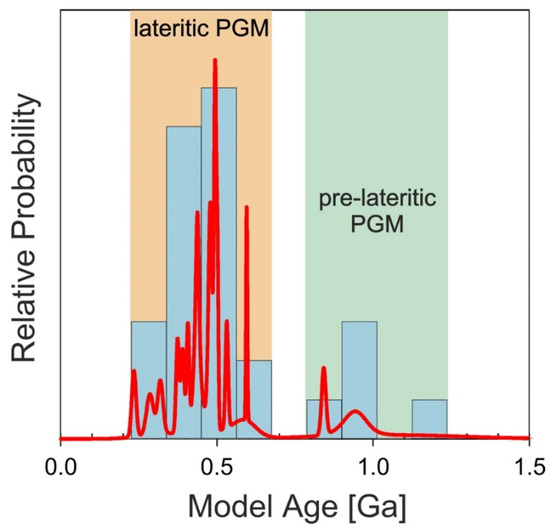 Cumulative probability plots and histograms (shaded bars, relative probability) of Os model ages from pre-lateritic and lateritic PGM analyzed in this study.