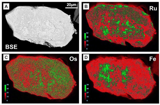 Quantitative EPMA element distribution maps (in wt%) of a typical ruthenian hexaferrum grain from the limonite horizon of the Falcondo Ni-laterite mine in the Dominican Republic. Note the negative correlation between Os and Fe: (A) back-scattered electron (BSE) image; (B–D) quantitative element maps for Ru, Os and Fe, respectively.