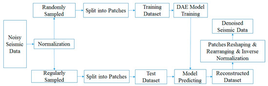 The patch numbers of the training and test sets were generally different. Each patch in the training set processed by cutting operator C had the same size n as the small block in the test set. Additionally, we used operator to ensure that all raw data were included in the denoising process. The entire process is illustrated in Figure 1.
