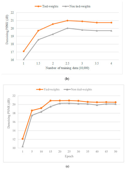 Denoising results with respect to the training number of tied weights and non-tied weights.
