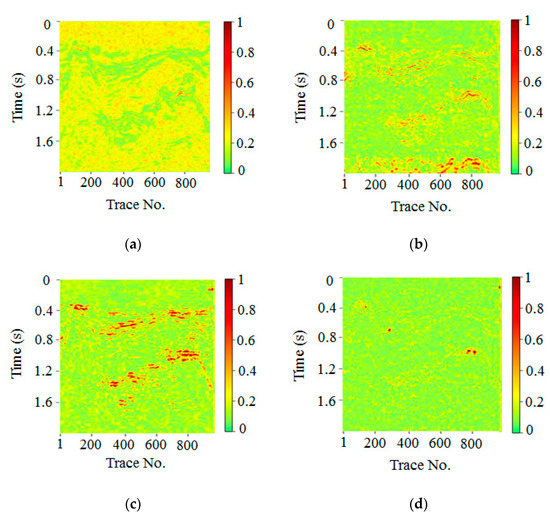 Local similarity describes the similarity of a seismic signal in relation to another one. Therefore, in local similarity analysis, we calculated the local similarity between the denoised result and removed noise to further study the signal leakage of denoised data. Figure 13a–d showed the local similarity analysis between the removed noise and denoising results obtained via FXDECON, MSSA, wavelet transform, and the proposed method, respectively. Local abnormal area similarities indicated that the noise and denoising results of the corresponding position were similar. In turn, this was indicative of signal leakage (i.e., damage to the original signal). As illustrated in the figure, there were many high-similarity abnormal regions in the MSSA and wavelet transform algorithm, which indicated considerable signal damage. In contrast, compared with the other methods, the proposed method exhibited less high-similarity outliers, meaning that the proposed procedure not only rendered less signal leakage but also preserved more effective signals after noise removal.