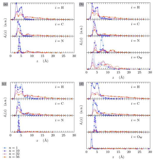 One-dimensional density profiles of i-th atom type (with i denoting , , and atoms, respectively). Four different setups are shown, corresponding to the hydrophobic siloxane surface without (a) and with (b) residual water molecules and to the hydrophilic alumina surface without (c) and with (d) residual water molecules, respectively. The displayed lines correspond to surface loading of (ultramarine squares), 10 (indigo circles), 32 (magenta crosses) and 56 (orange triangles) POPC molecules per given kaolinite surface. The value z denotes the distance of the i-th atom type from the kaolinite basal surface.