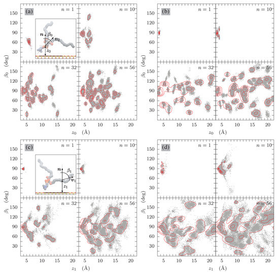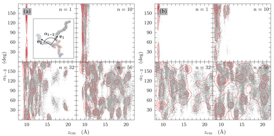 Figure 3 shows the internal tail–tail angle distribution with respect to the POPC center-of-mass distance from the kaolinite basal oxygens. Even at low and moderate loading ( and 10) the POPC molecular tails can adopt almost any orientation with respect to each other, with a slight preference for about 30 and , respectively. As the distributions are collected over simulation time, it becomes clear that the tails exhibit high levels of flexibility, as defined by the relatively low energy barriers of bond angles and dihedrals within the OPLS–AA force field. At high surface loadings, the internal tail–tail angles can adopt almost any orientation.