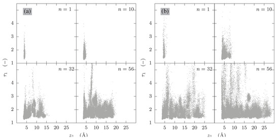 Another important measure of the internal order of the POPC molecules is their curvature, expressed through the so-called tortuosity parameter , calculated as the ratio between the bond-to-bond accumulative tail fragment length and the Euclidean distance between the first and last carbon of i-th tail fragment (), respectively. It is important to note that the reference value of an OPLS-AA optimized tail is . Figure 4 shows the tortuosity parameter of the oleic acid tail fragment at both kaolinite surfaces. Regardless of surface loading or type of kaolinite surface, the majority of the tail tortuosities exceeds the reference value, hence adopting at least a partially folded conformation.