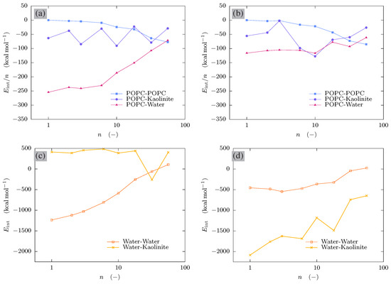 Figure 6 displays the interaction energies of various pair moieties with respect to the surface loading n (note that since the total number of molecules remains constant regardless the n value, the interaction energies involving only the residual water molecules and kaolinite are displayed separately and are not weighted by the POPC surface loading parameter n). The energies correspond to the sum of intermolecular Van der Waals and electrostatic interactions. Intramolecular potential energy contributions are not included. The displayed mean values are calculated over the 1000 selected snapshots of the equilibrated system within the production phase.