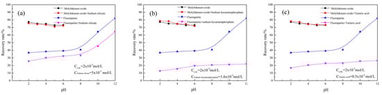 Effect of the three depressants on the floatability of molybdenum oxide and fluorapatite at different pH values: (a) sodium silicate; (b) sodium hexametaphosphate; (c) tartaric acid.
