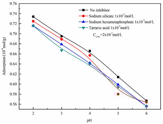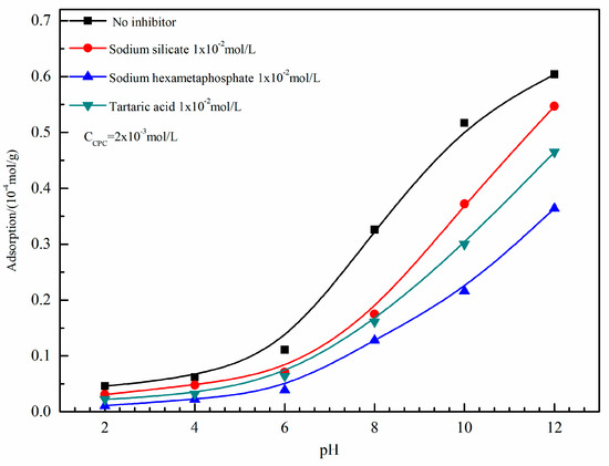 Figure 2 shows the effects of inhibitors on the adsorption of CPC on the surface of molybdenum oxide at different pH values. It can be observed that the adsorption of CPC decreased gradually with an increasing pH. In the presence of each of the three depressants, CPC adsorption was lower than that without the depressants, but the difference was not more significant. The effects of the three depressants on the adsorption of CPC on the surface of molybdenum oxide followed the order tartaric acid > sodium hexametaphosphate > sodium silicate.