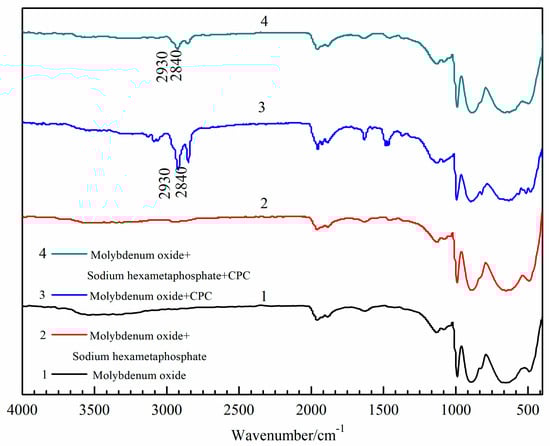 After interacting with sodium hexametaphosphate, spectrum (2) was obtained, which exhibited no noticeable changes. As the flotation tests on individual minerals showed that sodium hexametaphosphate inhibited molybdenum oxide, which may be due to the physical adsorption of sodium hexametaphosphate on the surface of molybdenum oxide, Spectrum (3) shows the absorption bands at 2840 cm−1 and 2930 cm−1, which were the characteristic of –CH2– and –CH3, indicating that the adsorption of CPC occurred on the molybdenum oxide surface. However, the absorption bands become weaker in spectrum (4), indicating that sodium hexametaphosphate reduced the adsorption of CPC on the surface of molybdenum oxide; however, based on the flotation tests of molybdenum oxide, the depression was very weak.
