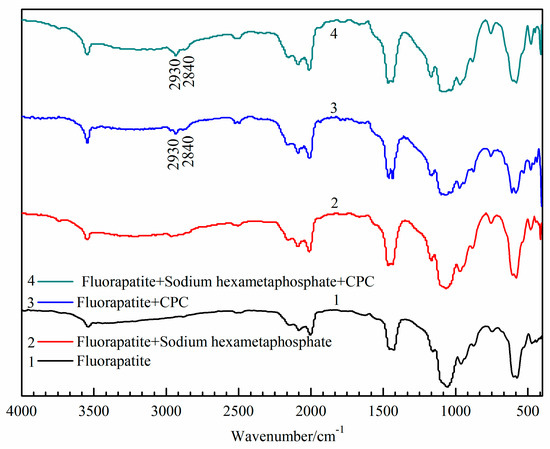 To investigate the adsorption mechanism of sodium hexametaphosphate on fluorapatite, the infrared spectra of fluorapatite before and after the addition of sodium hexametaphosphate were analyzed and are shown in Figure 5.