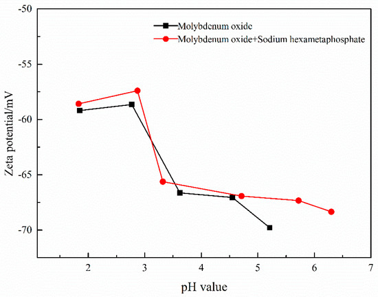 (3) The zeta potential results showed that the sodium hexametaphosphate greatly altered the surface characteristics of fluorapatite by decreasing its surface charges. These results further indicated that the addition of sodium hexametaphosphate increased the magnitudes of the repulsive forces between molybdenum oxide and fluorapatite, which could provide an effective separation between these minerals.