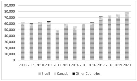 According to the United States Geological Survey (USGS), Brazil is the largest niobium producer at the world level, and this trend has been maintained over the last few decades (Figure 1). Only in 2020, this single country was responsible for 91% of the niobium world production, followed by Canada (8%) [23]. Niobium reserves are also mainly concentrated in Brazil (95%) and Canada (3.5%), while the remaining are located in Angola, Australia, and South Africa, among others [24].