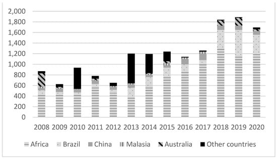 More than 60% of tantalum reserves are hosted in the Democratic Republic of Congo (DRC), while the remaining are in Brazil and Australia [25]. DRC alone was responsible for 40% of the total world production in 2020 [23]. Historical tantalum production can be seen in Figure 2, clearly showing the predomination of Africa over other regions of the world.