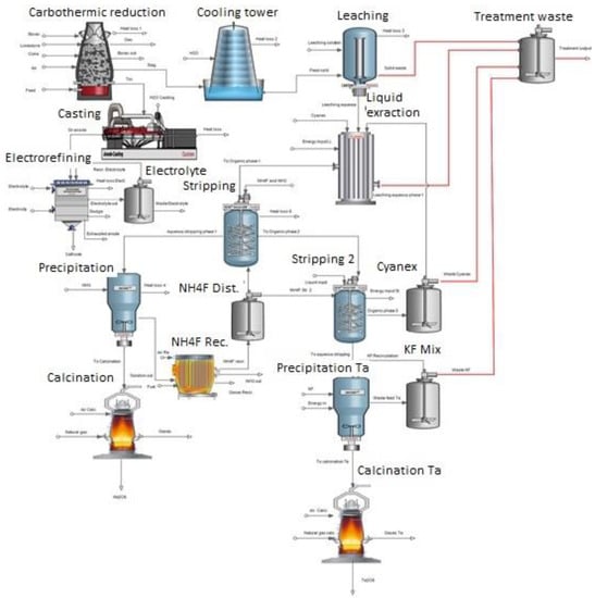 The aim of this study is to analyse the possibilities of the recovering process of Nb and Ta from tin slags using a simulation of a metallurgical plant. Similar simulations using the same software to recover metals from common rocks, such as iron, lead, zinc, and gold, have been carried out in previous studies [33,34,35].
