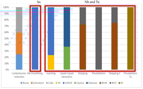 Share of reagents needed in each unit of the treatment and beneficiation process of Sn, Nb, and Ta.