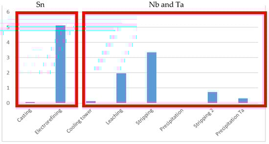 As mentioned, several metallurgical processes are needed to purify Nb and Ta from that ore. Various reagents must be mixed with the feed to produce changes in the phases and separate them so that they finally end up precipitating in the form of almost pure metal. At the end of the simulation, to obtain 30 kg of Nb and 50 kg of Ta, more than 3000 kg of chemicals were used to reach full separation. Moreover, the amount of water needed in the process is not negligible either. Around 12,000 kg of water has to be used to process one ton of ore, of which around 6000 kg are needed in the electrorefining process to purify tin. The rest is used in the remaining processes to concentrate Nb and Ta.