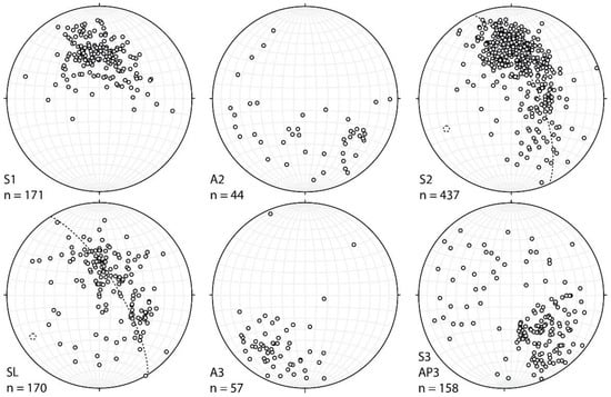 Schmidt stereographic projections (equal-area, lower hemisphere) of structural data, including Variscan (S1, S2) and Alpine (S3) poles to foliations, Variscan (A2) and Alpine (A3) fold axes and axial planes (AP3), and Permian sedimentary bedding (SL). Data are distinguished on relative chronology. Dotted lines and poles represent cylindrical best fits.