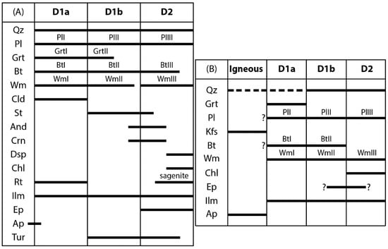 Deformations stages versus mineral growth in metapelites (A) and metagranitoids (B). Mineral abbreviations are from [51].