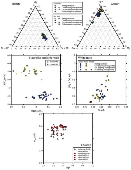 The following mineral compositional evolutions are here summarized and highlighted in Figure 8 and Table 2: (1) replacement of Ca by Fe2+ from GrtI to GrtII; (2) decrease in Si and Mg + Fe content from WmI to WmII to WmIII; (3) increase in XMg from BtI to BtII; (4) increase in An component from PlI to PlII and decreasing from PlII to PlIII. Chlorite composition seems to be controlled by the microstructural site: chlorite replacing andalusite and staurolite has XMg = 0.34–0.36, chlorite replacing chloritoid has XMg = 0.17–0.29, chlorite rimming garnet shows XMg = 0.09–0.37 and the lowest Al content (Figure 8).