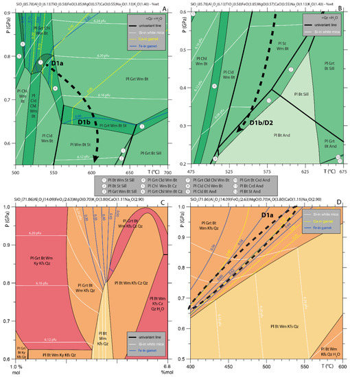 In the metapelites, the syn-D1a assemblage plagioclase + garnet + biotite + white mica + chloritoid + quartz was stable at T = 530–560 °C and P = 0.6–0.8 GPa (Figure 9A). The resulting stability field was delimited at low temperature and high pressure by chlorite-in and chloritoid-out curves, at high temperature by chloritoid-out and staurolite-in (T = 560 °C) curves, and at low-pressure by garnet-out curves. Within the D1a field, the garnet composition changed from Alm79Grs16Prp5 to Alm87Grs8Prp5 under increasing of the T/P ratio. The Si content in white mica is 6.20 apfu and consistent with P ≃ 0.8 GPa. The computed compositions matched those of GrtI (Alm81Grs14Prp5) and WmI (Si ≥ 6.20 apfu) in the metapelites for T = 530–550 °C and P ≃ 0.8 GPa.