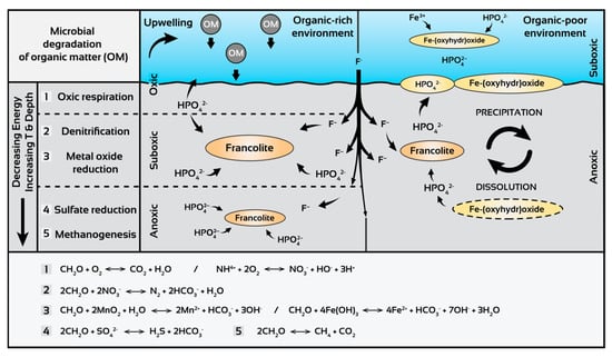 Different phosphogenic processes. In upwelling environments, organic matter (OM) is microbially degraded through a series of chemical reactions that lead to the concentration of dissolved phosphate in pore water, facilitating the authigenic precipitation of carbonate fluorapatite. In organic-poor environments, Fe redox pumping is the primary process leading to high concentrations of phosphate in pore water via cyclical adsorption and release of phosphate from Fe oxyhydroxides. (Modified from Pufahl and Groat (2017), and references therein [2]).