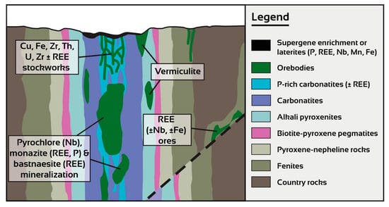 Geological cross-section of a hypothetical carbonatite–alkaline system and main related mineral deposits [53,59]. Not to scale.