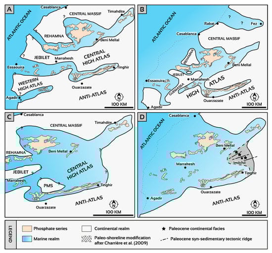 - A system of narrow gulfs separated by emerged lands (Figure 8A,B; Rehamna and Jebilet Hercynian massifs) [89]. In this paleogeographic configuration, the opening to the Atlantic would correspond to several narrow corridors [89]. For some authors, the opening to the Atlantic was through at least three distinct gulfs (Ouled Abdoun–Ganntour, Ouarzazate–Essaouira, and Souss) [88,89].