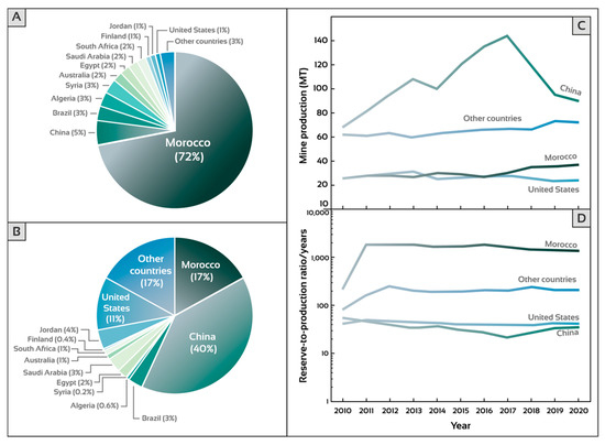 Phosphate reserves are dynamic and changeable over time, depending on several factors, including production rates, the discovery of new reserves, and the reclassification of resources and reserves [9,109]. Currently, there are several sources of publicly available global inventory data on resources/reserves and the production and consumption of phosphates. These data are commonly reported every year by the major geological surveys (e.g., USGS, WMD, BGS, etc.) [110]. In fact, the most comprehensive study on phosphate reserves and resources remains that of Steven Van Kauwenbergh in 2010 [111], which summarizes the results of several previous studies, showing that the estimates of reserves range from 15,000 MMT (Million Metric Tons) to over 1,000,000 MMT, while resource estimates range from ~91,000 MMT to over 1,000,000 MMT. However, the only major geological survey providing up-to-date data regarding global phosphate rock reserves is the USGS, which shows that the current global resources of phosphate rock are more than 300,000 billion tons, and the reserves are of ~71,000 MMT [17]. Morocco holds the largest reserves in the world, with 70-75% (approximately 50,000 MMT) of the total world’s known phosphate reserves (Figure 9A) [17]. However, these estimated reserves have not changed since 2010, while the production has increased over the same period (Figure 9). This situation clearly justifies the need to reevaluate the resources and reserves in Morocco, given their importance on the global market. Either way, the share of Moroccan reserves is expected to increase in the coming decades owing to its relatively high reserve-to-production ratio compared with other producing countries. While Morocco has the largest reserves, China contributes 40% of the global production, compared with 17% for Morocco (Figure 9B). The United States, which was once the largest producer, contributes currently only 11% to global production. The USA was surpassed by China in 2006 [112], and by Morocco in 2017 (Figure 9C). At the current production rate, Morocco has the highest reserve-to-production ratio, with more than 1300 years, while all other countries do not exceed 200 years of mine production (Figure 9D). However, the reserve-to-production (R/P) ratio indicates the lifetime of the reserves at current production rates; it does not take into consideration the possible changes and reclassification of reserves and resources [9]. For Morocco, this ratio is expected to decrease, knowing that its production is increasing continually, having increased by 43% over the past 10 years, from 25,000 MT in 2010 to 37,000 MT in 2020 (Figure 9D).